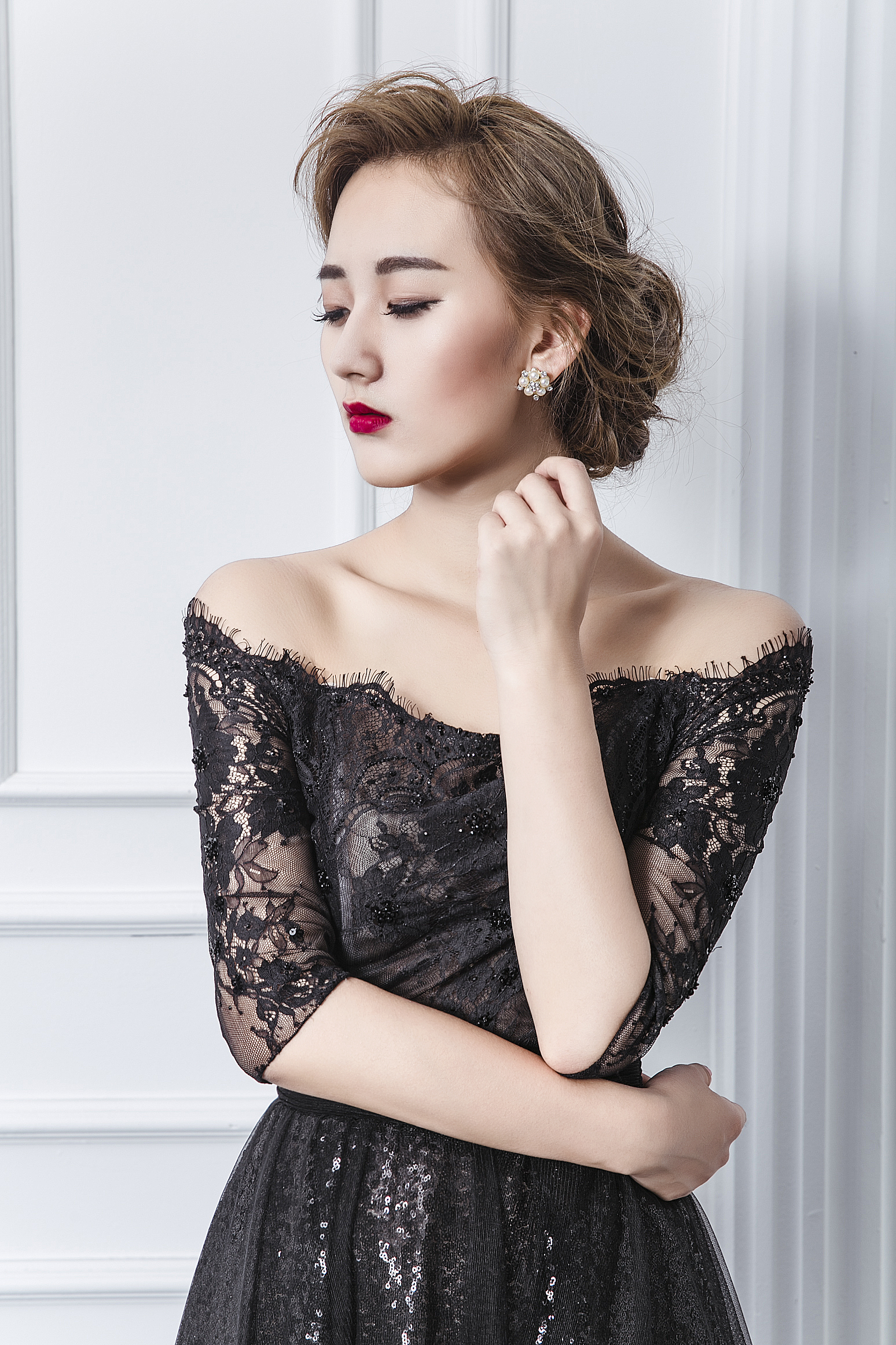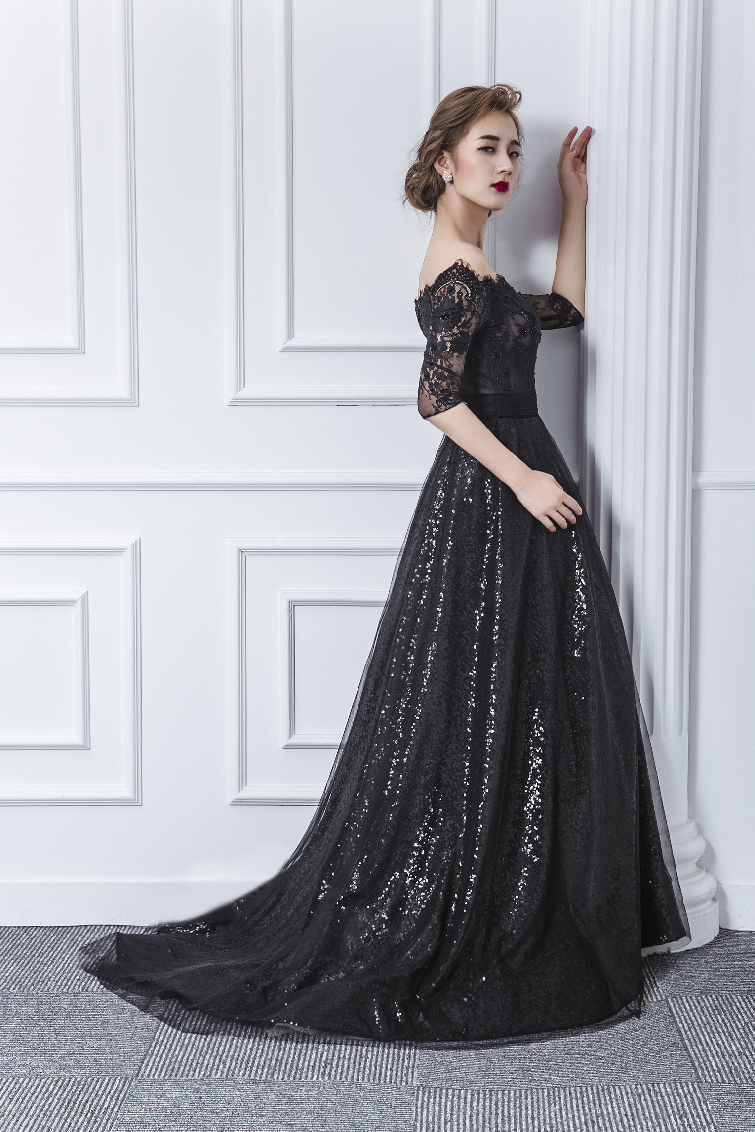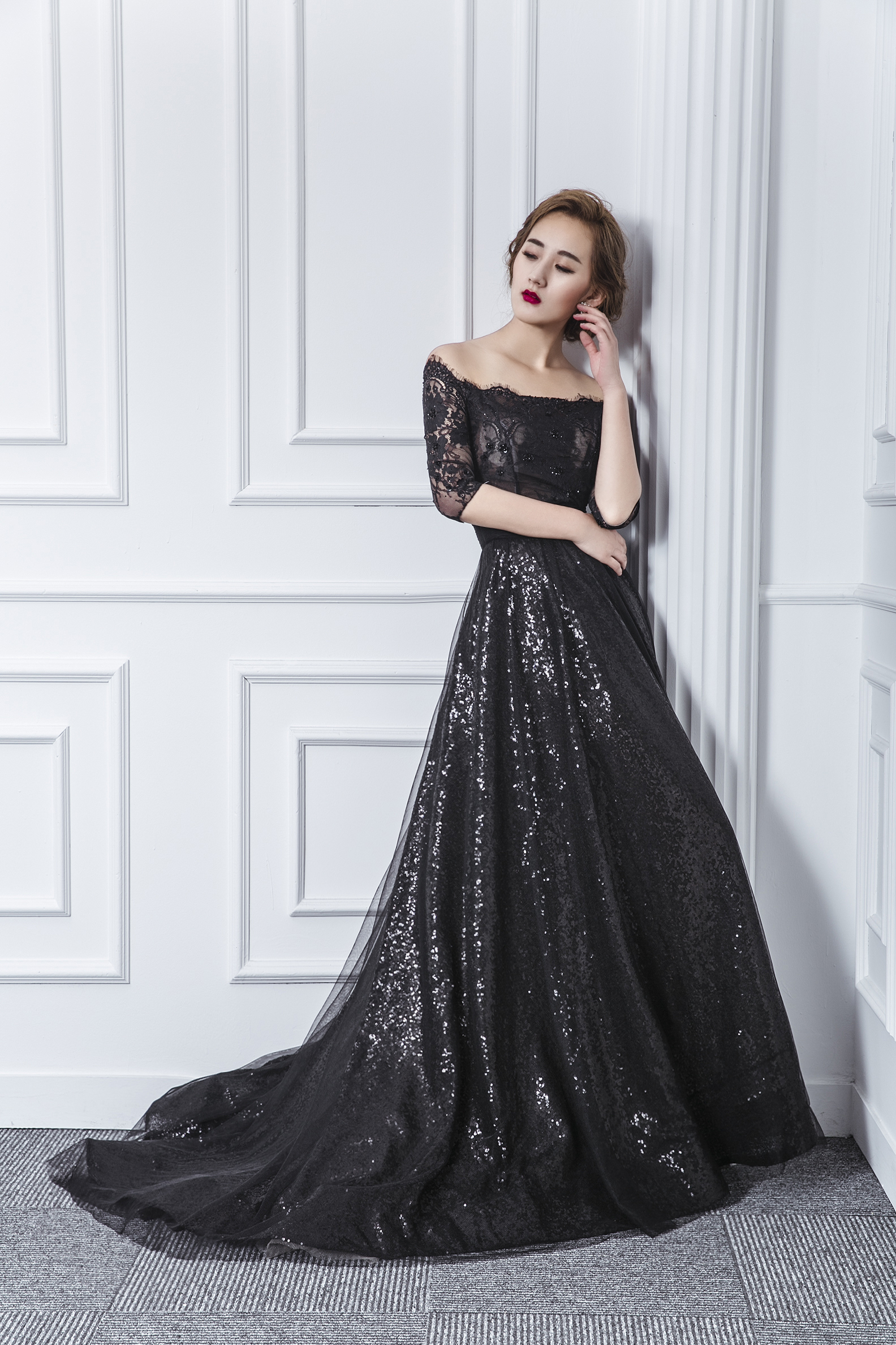 一字肩 黑色蕾丝开叉晚礼服