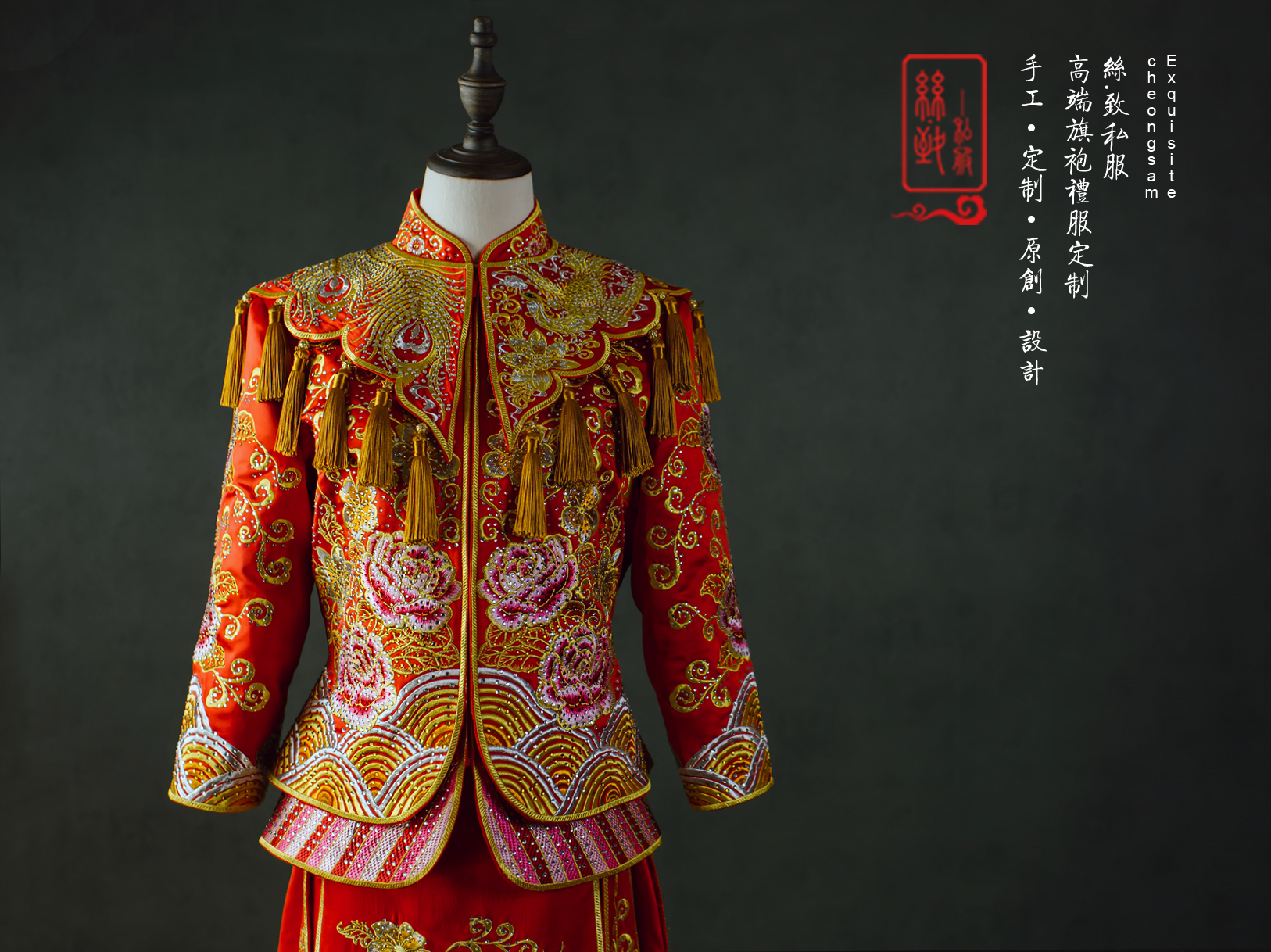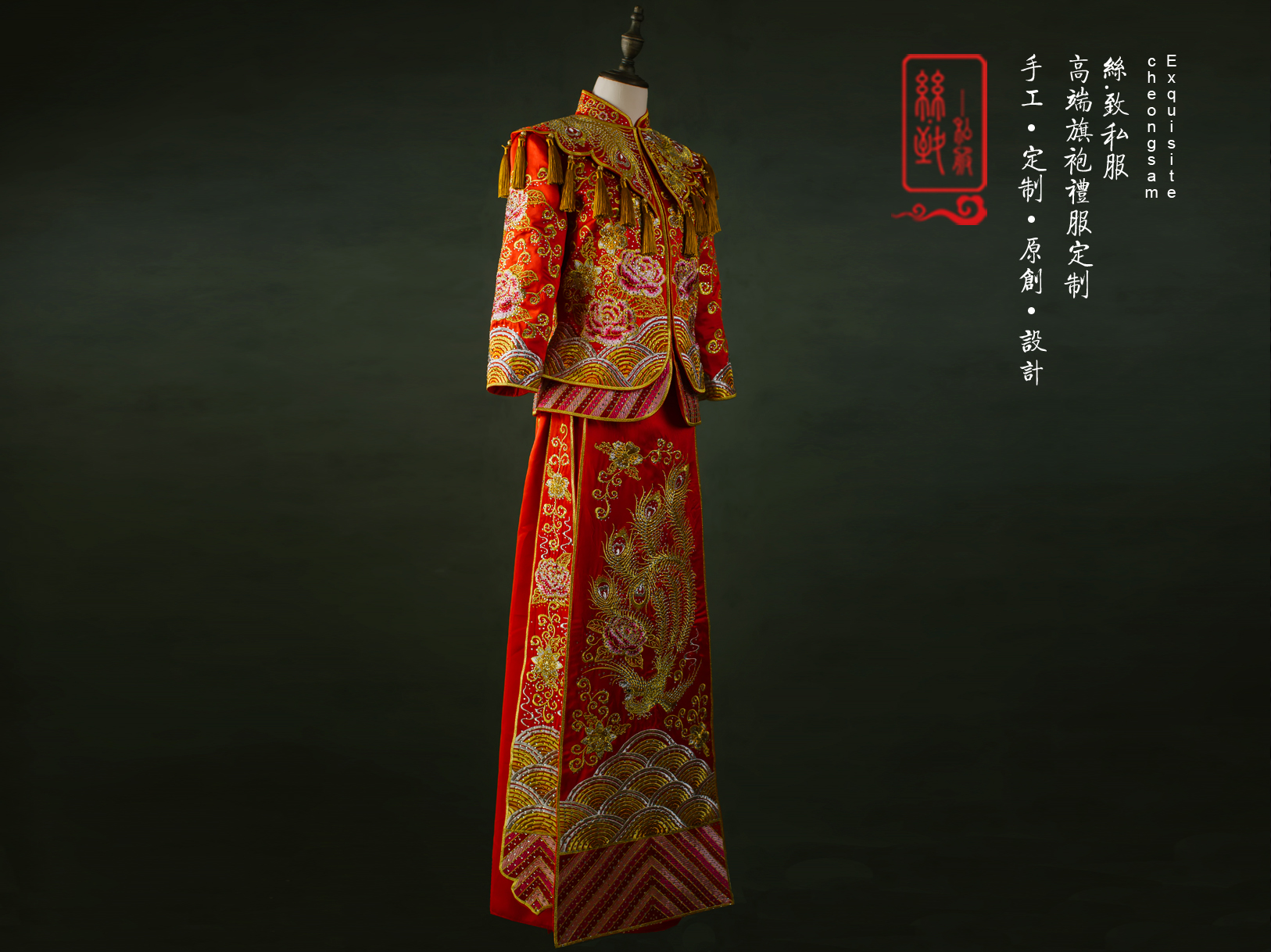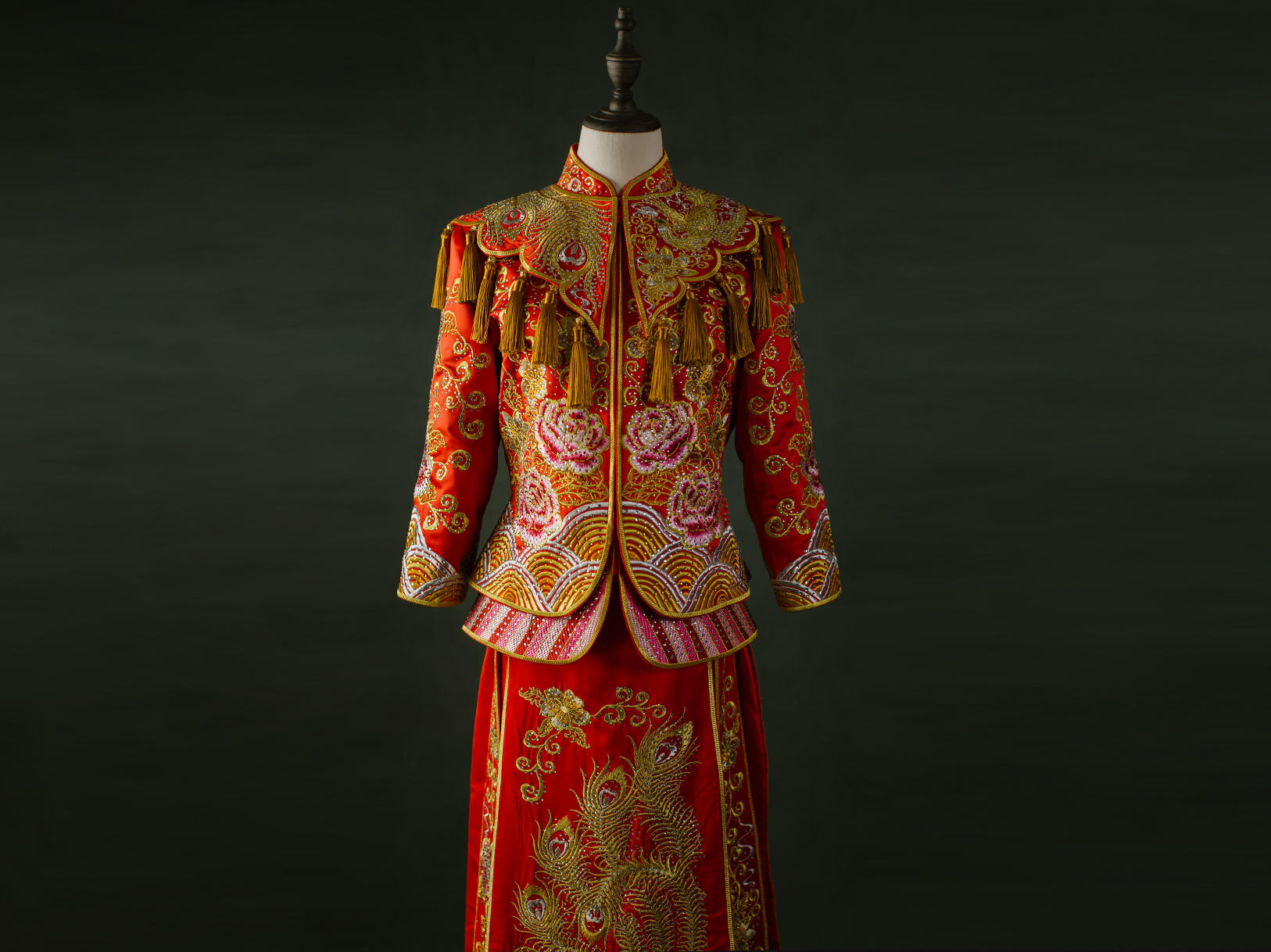 重工牡丹凤凰秀禾服一套租赁3天,手工头饰一套租赁,赠送手工绣花鞋一双。有押金,无清洗费。