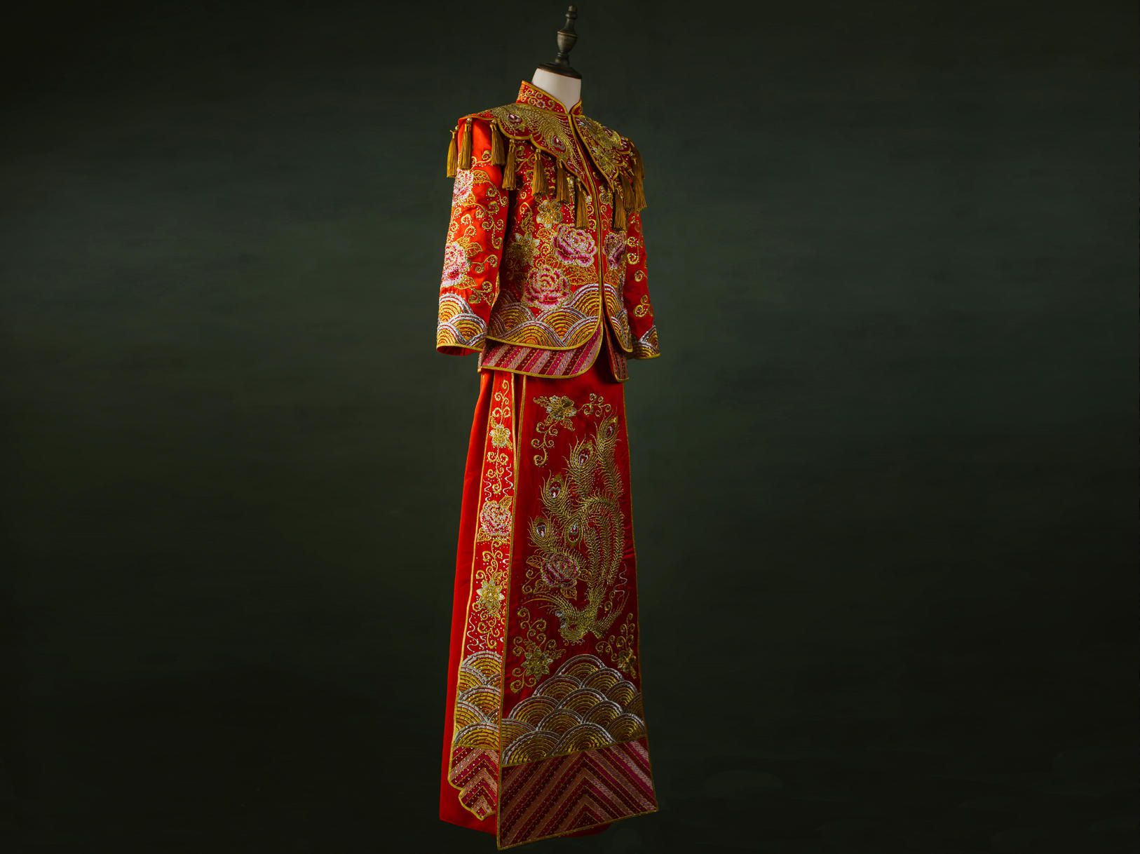重工牡丹凤凰带披肩秀禾服租赁套餐,含头饰一套,绣花鞋赠送。