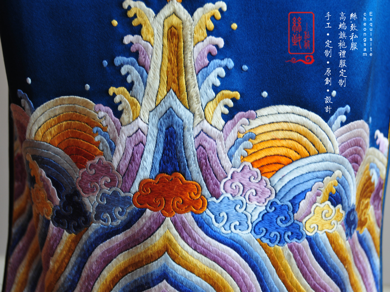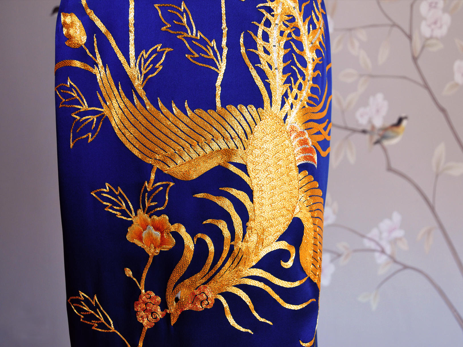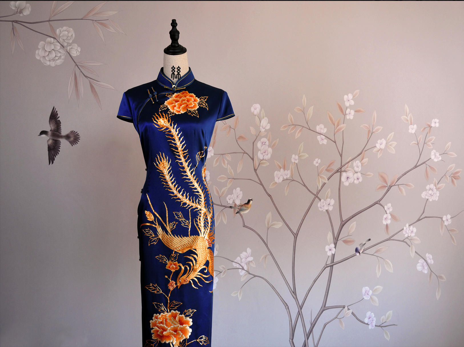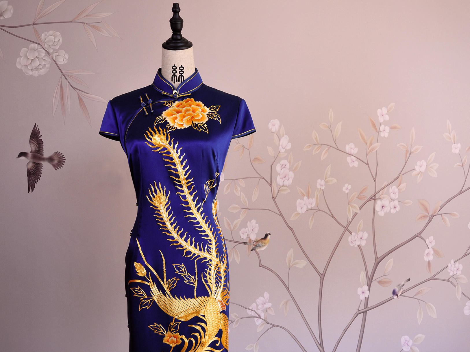 海水江崖凤戏牡丹,采用苏绣最经典的平针绣和盘金绣花,绣工精美耗时2月,所谓是一件行走中的古董级旗袍。本店量体定制,真开襟大襟旗袍。