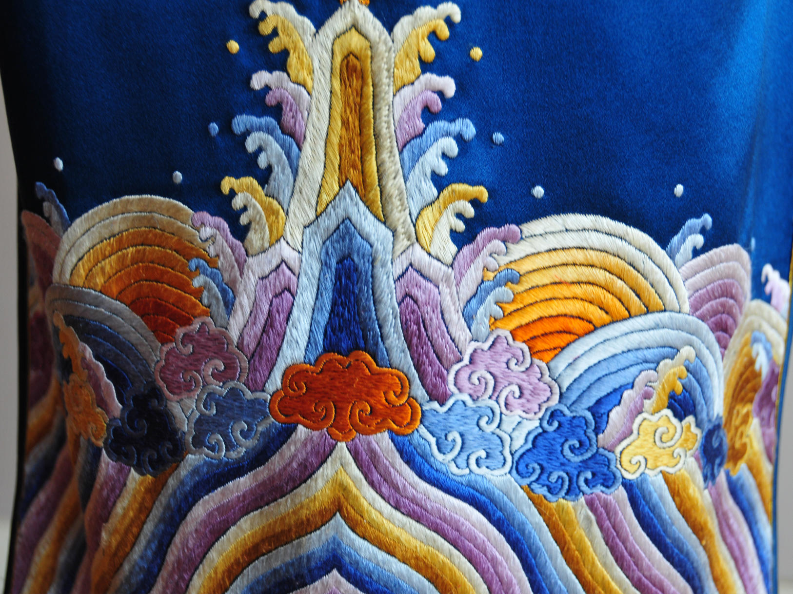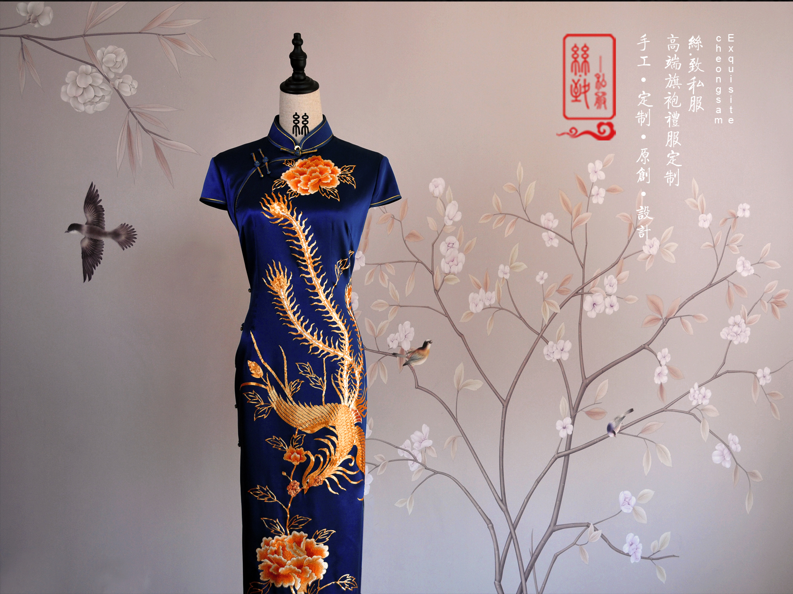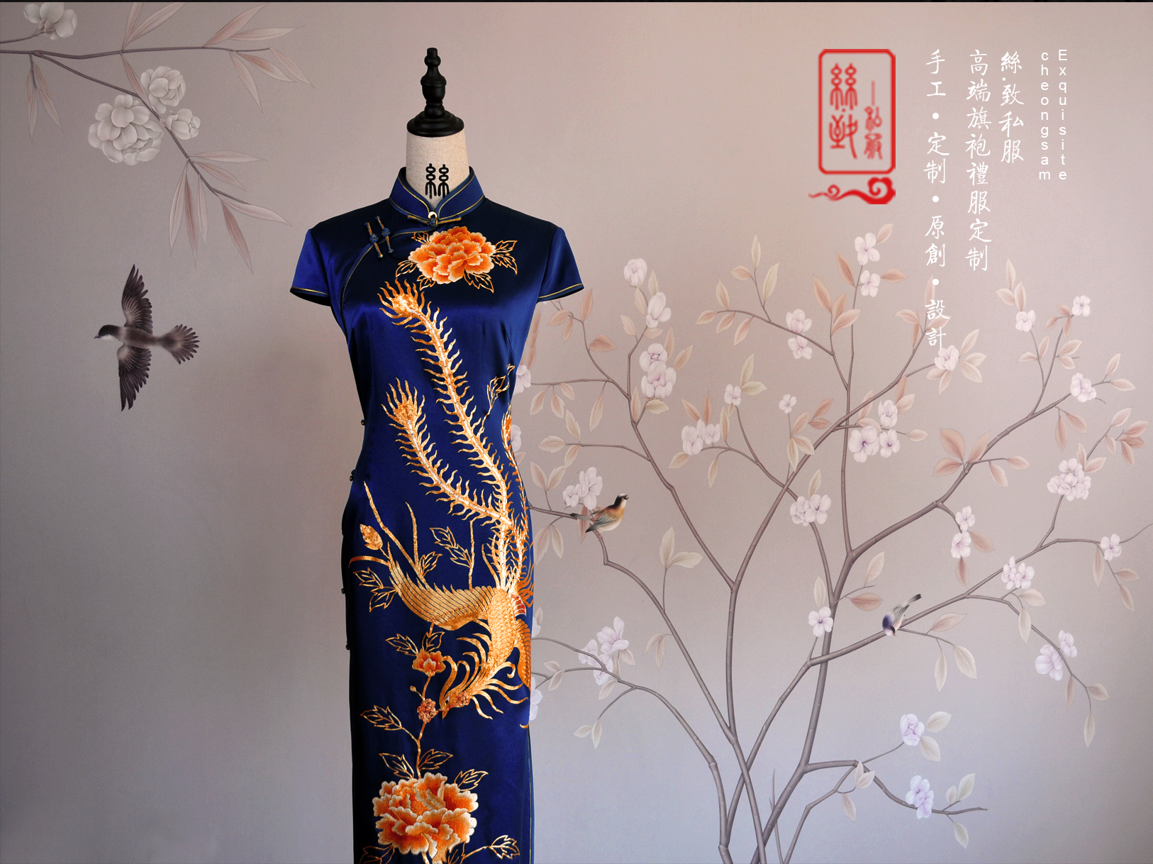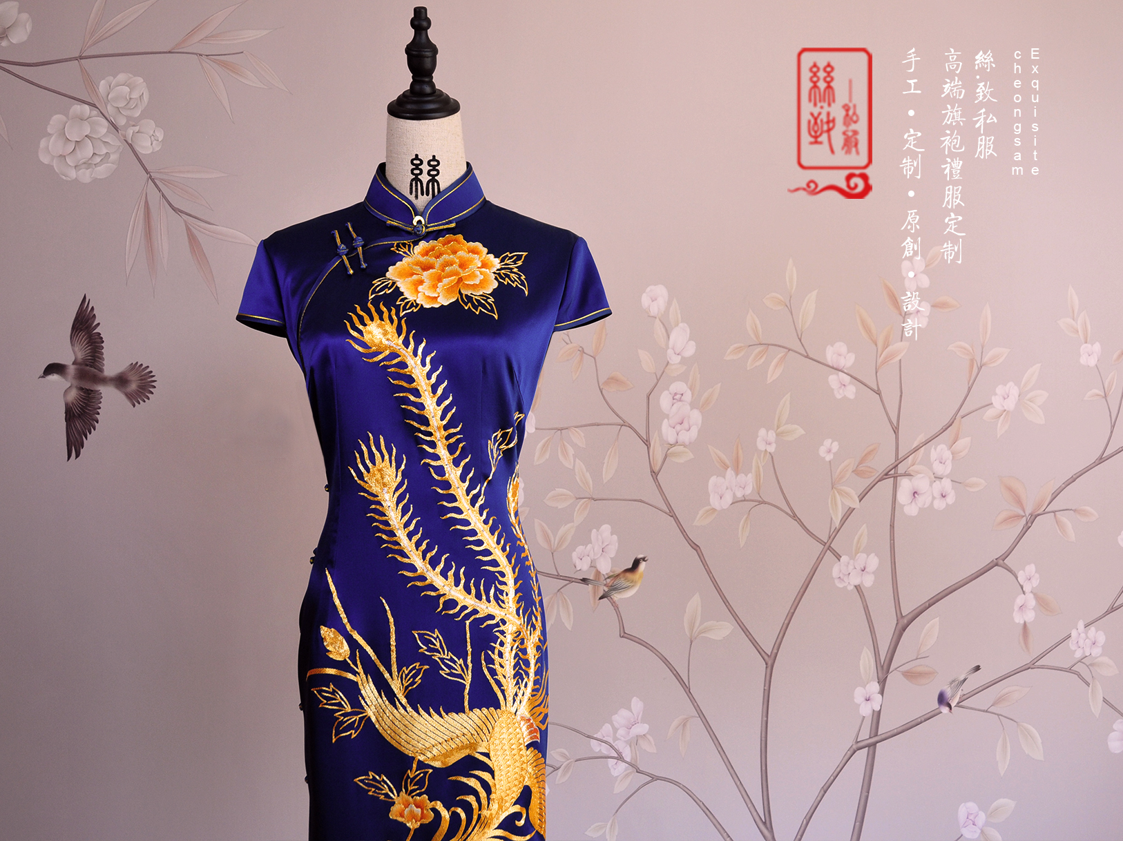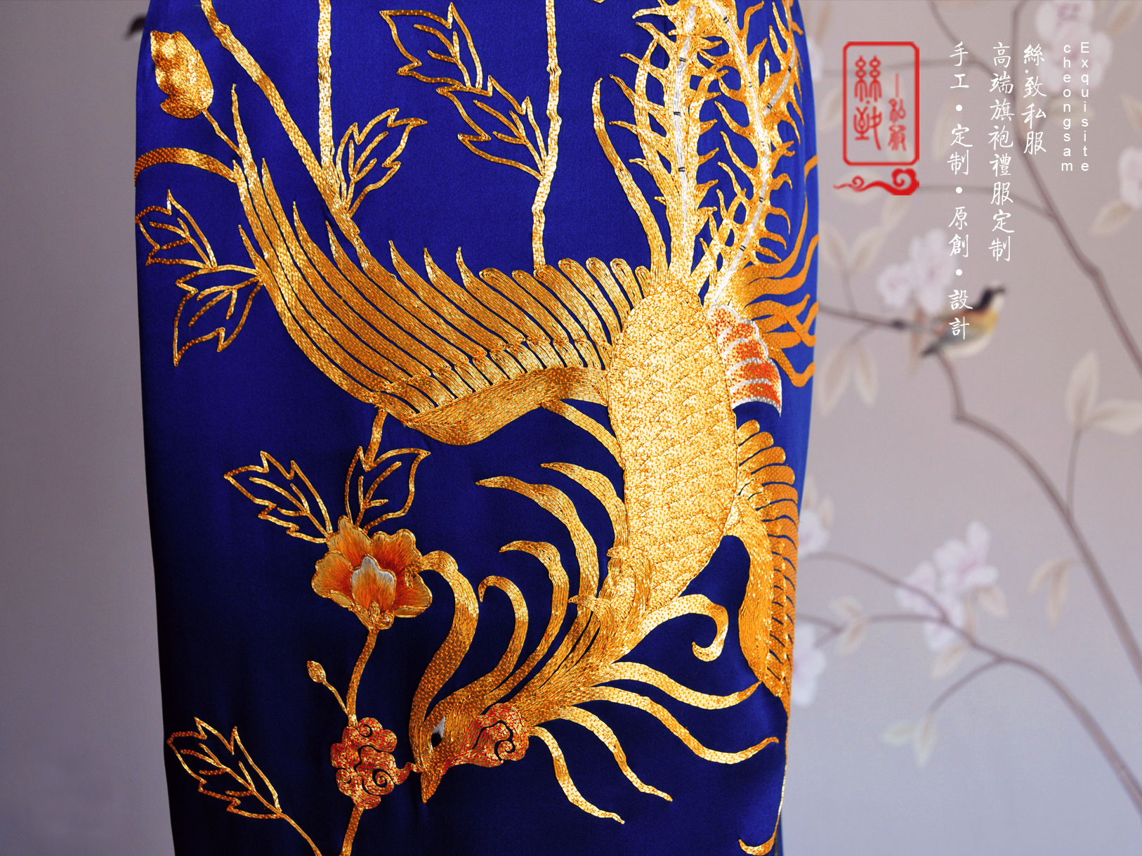 海水江崖凤戏牡丹,采用苏绣最经典的平针绣和盘金绣花,绣工精美耗时2月,所谓是一件行走中的古董级旗袍。本店量体定制,真开襟大襟旗袍。