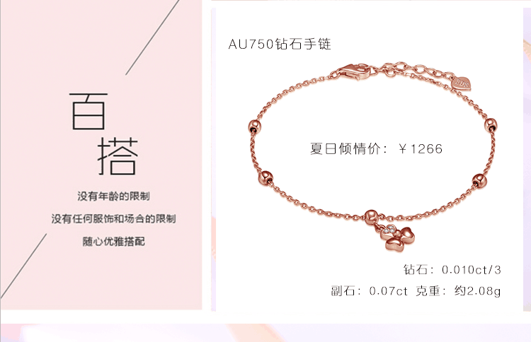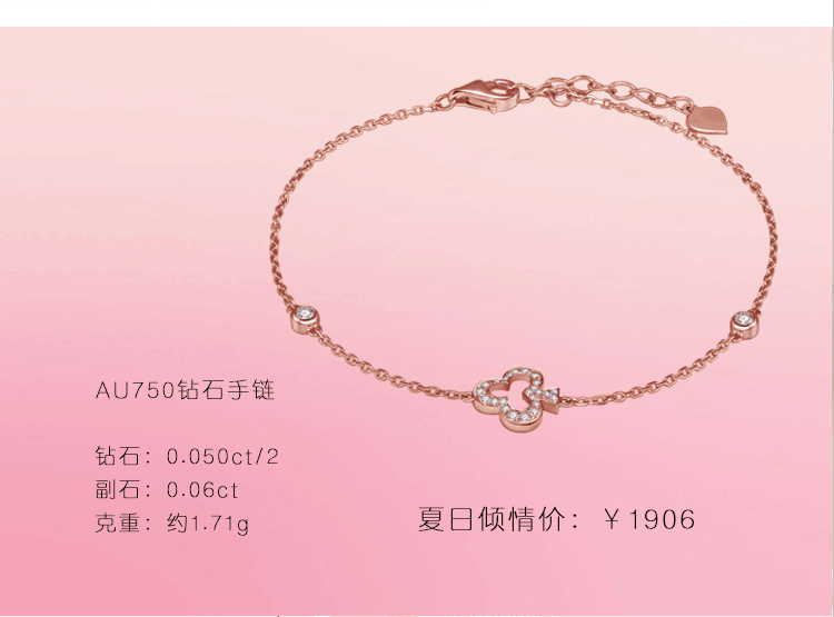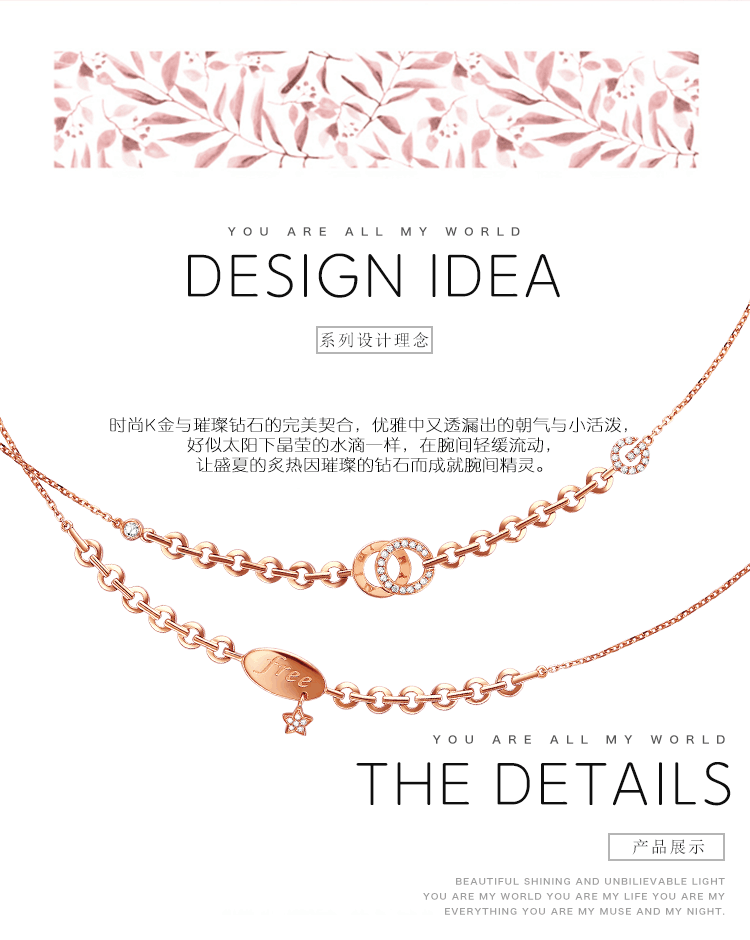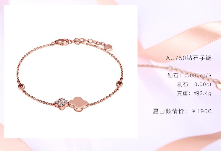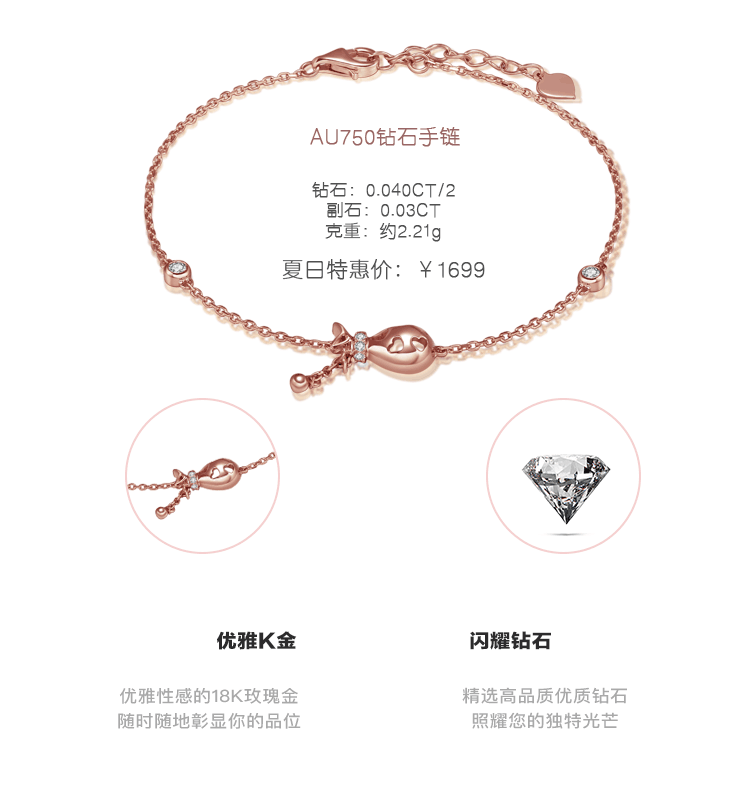 EDS珠宝|夏日清新手链系列<br />时尚K金与璀璨钻石的完美契合,优雅中又透漏出的朝气与小活泼,<br />好似太阳下晶莹的水滴一样,在腕间轻缓流动,<br />让盛夏的炙热因璀璨的钻石而成就腕间精灵。
