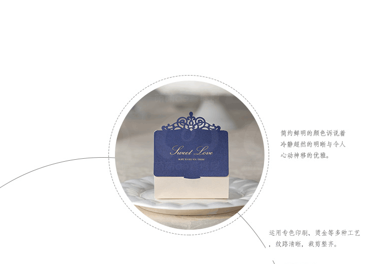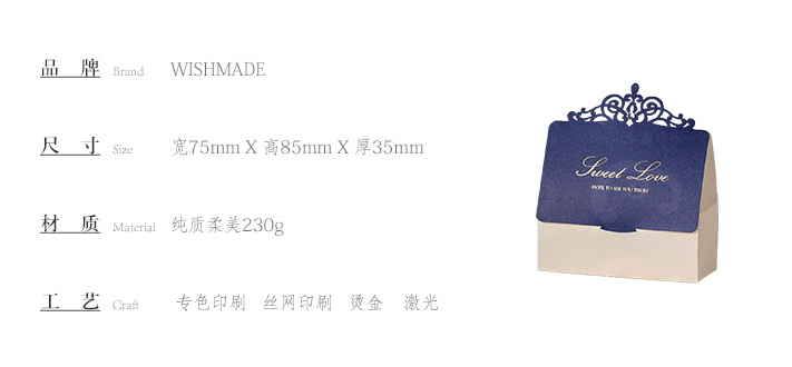 1、创意婚礼喜糖盒深蓝色。<br />2、产品参数较多,价格请详询萌萌。