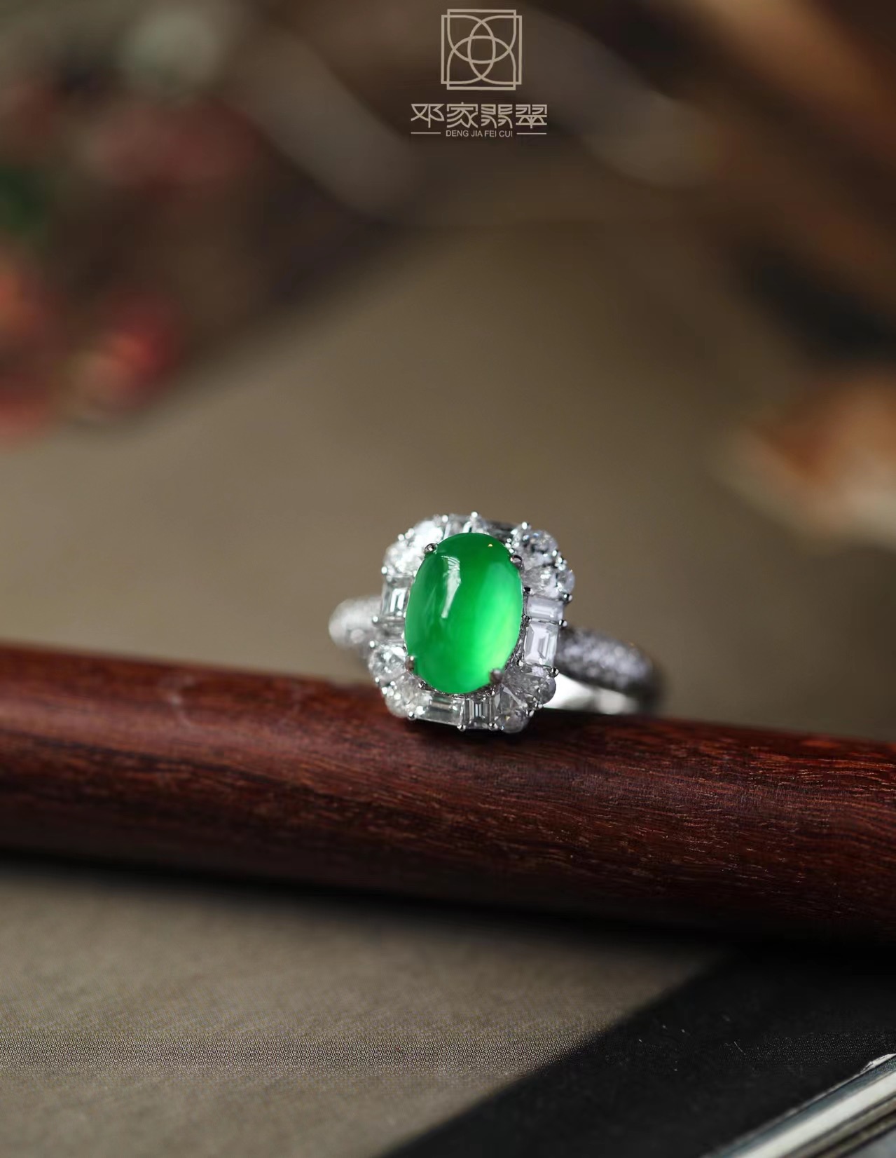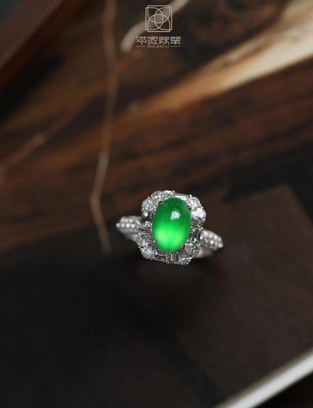 邓家翡翠婚嫁系列之绿戒指,一枚可传承的东方戒指。<br />这枚翡翠戒指,以绿到起光的玻璃种翡翠蛋面为主石 18K金镶嵌 白钻为配石