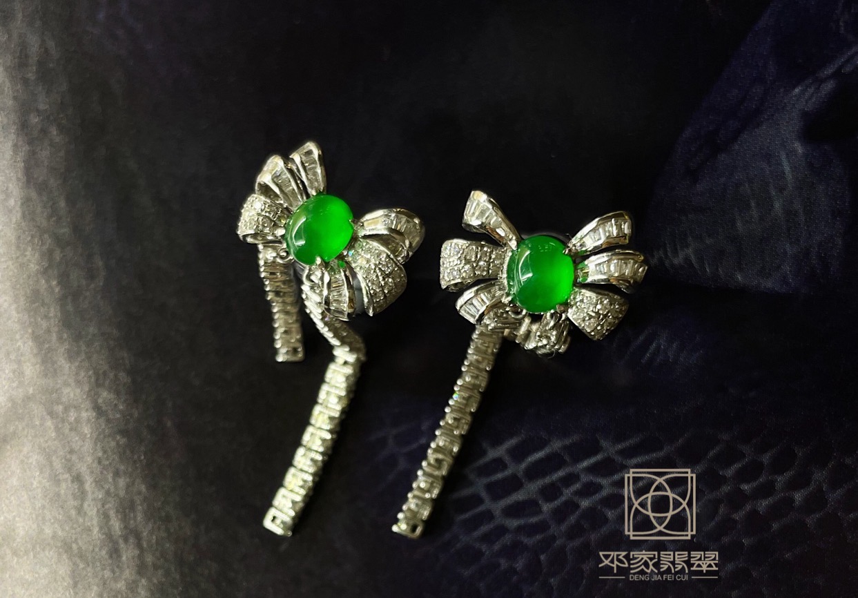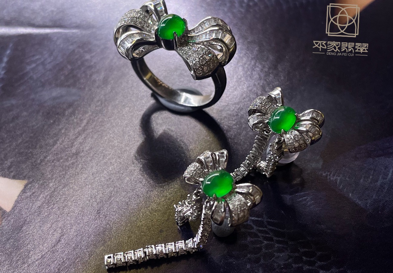 不知道最初是谁发明了蝴蝶结这个图案,它有一种让少女和熟女都为之倾心的魔力。<br />高定工厂的一小套件,把蛋面置于缱绻灵动的花瓣中间,线条流畅,简洁大气。圆润饱满的翡翠蛋面:绿得可人,种水色一样不少,白钻为配石 18K金镶嵌。<br />