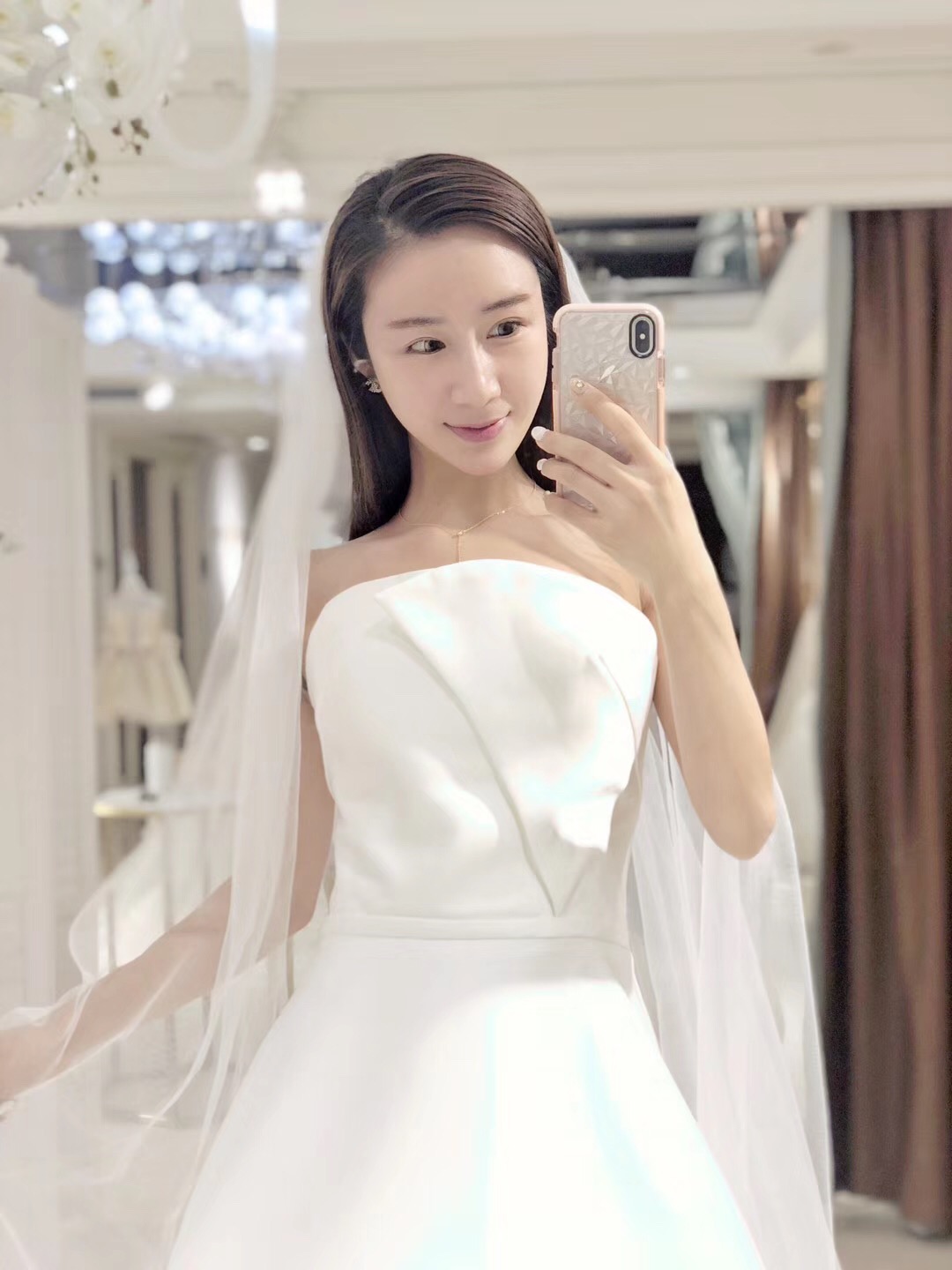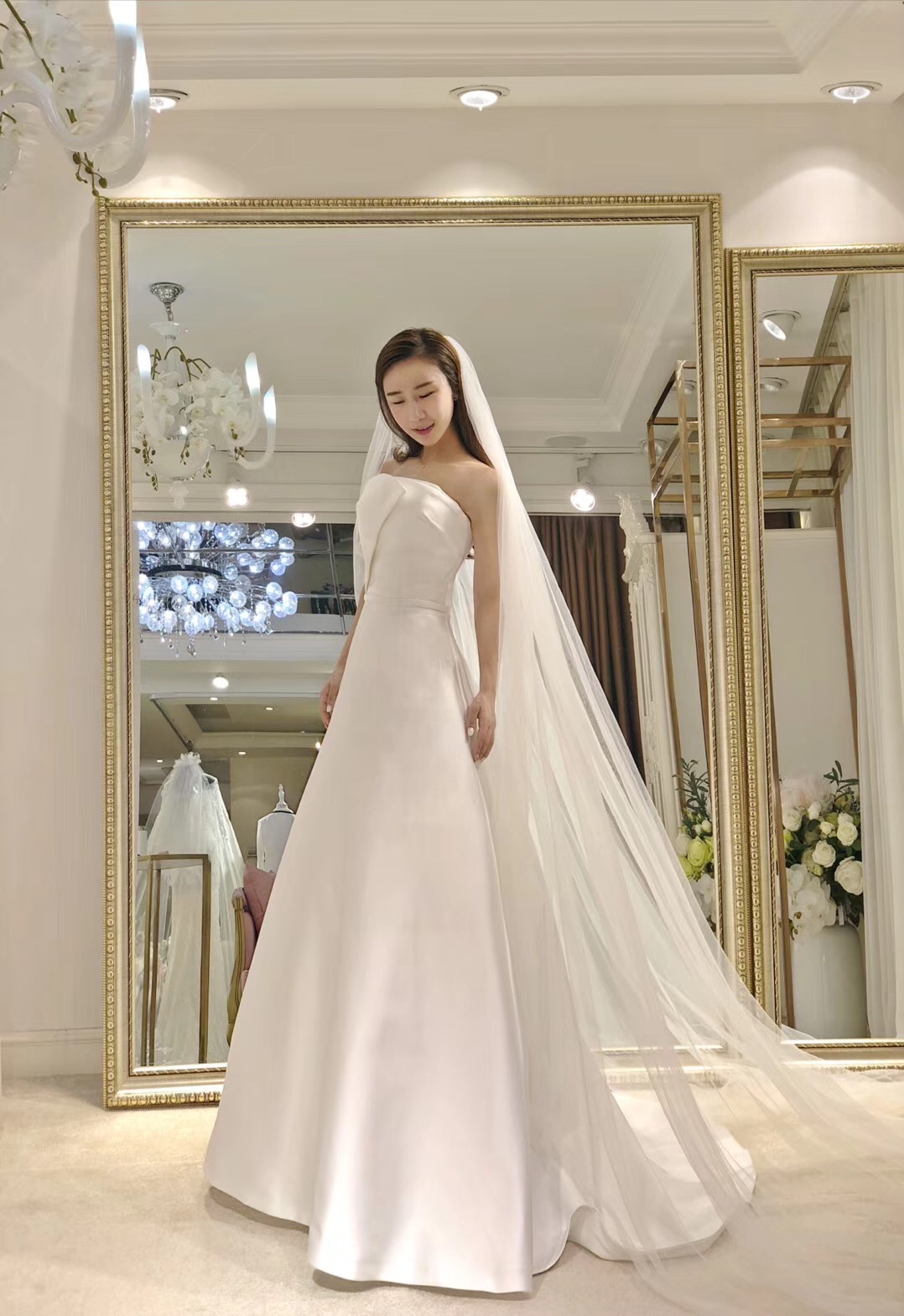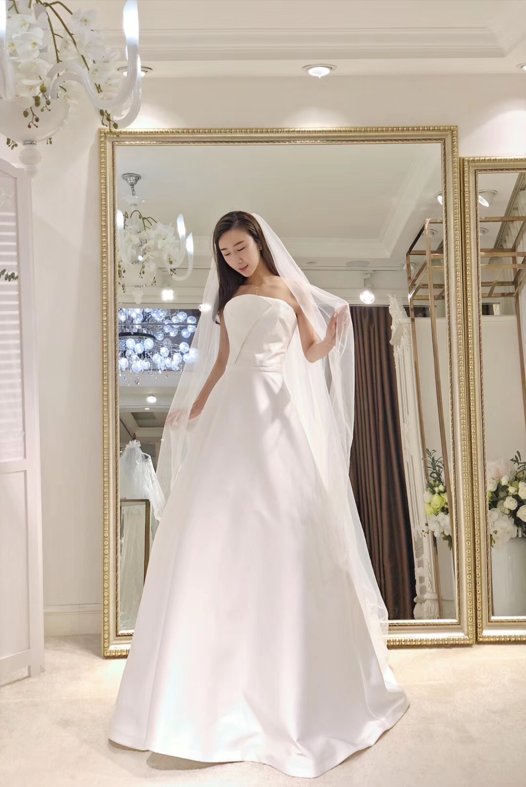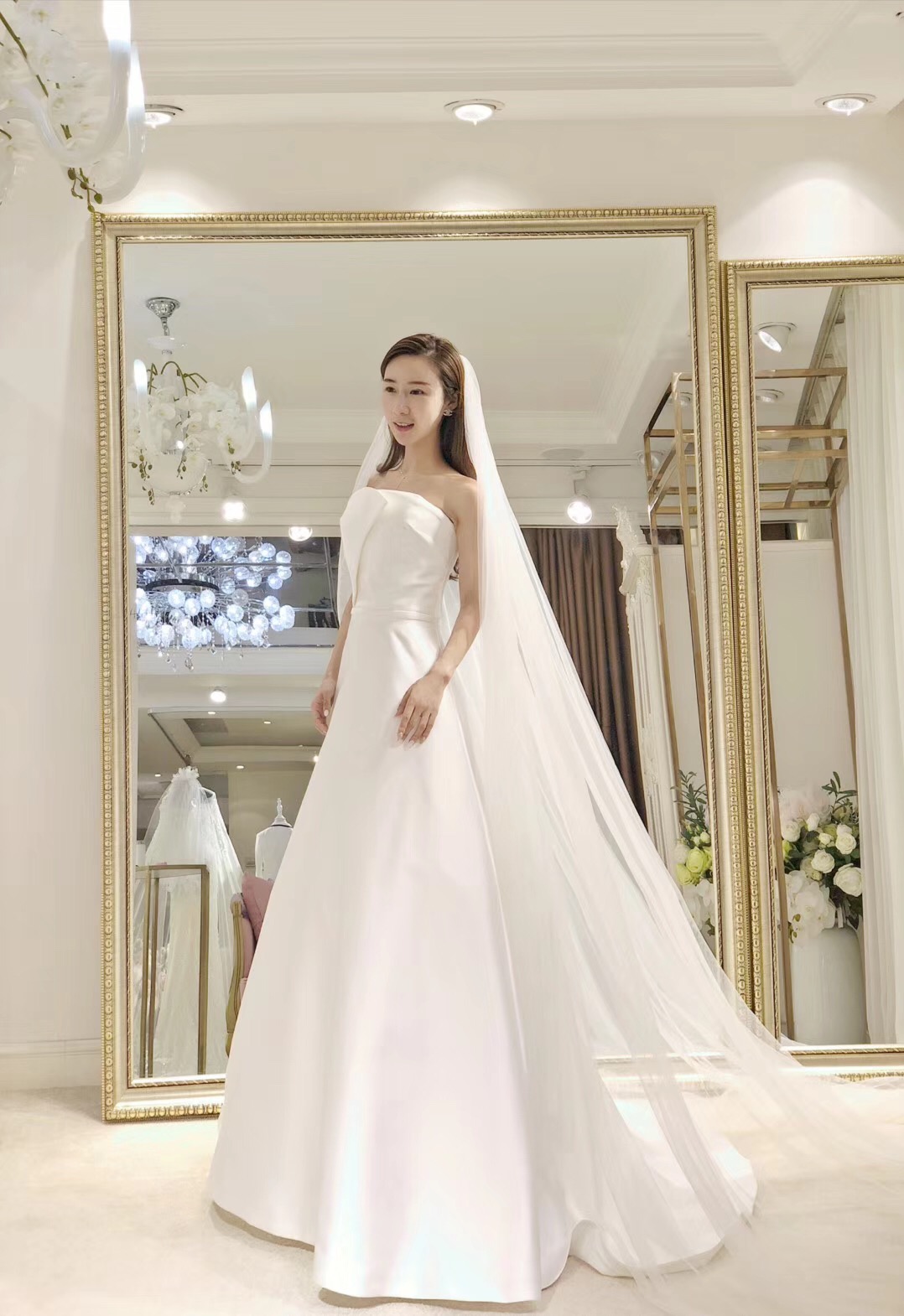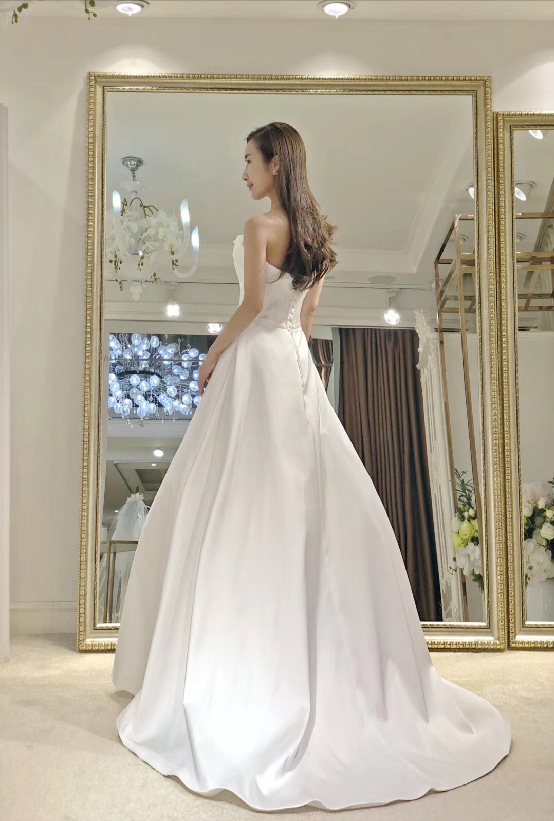 抹胸、A字型婚纱、腰线高,更能凸显新娘的高挑
