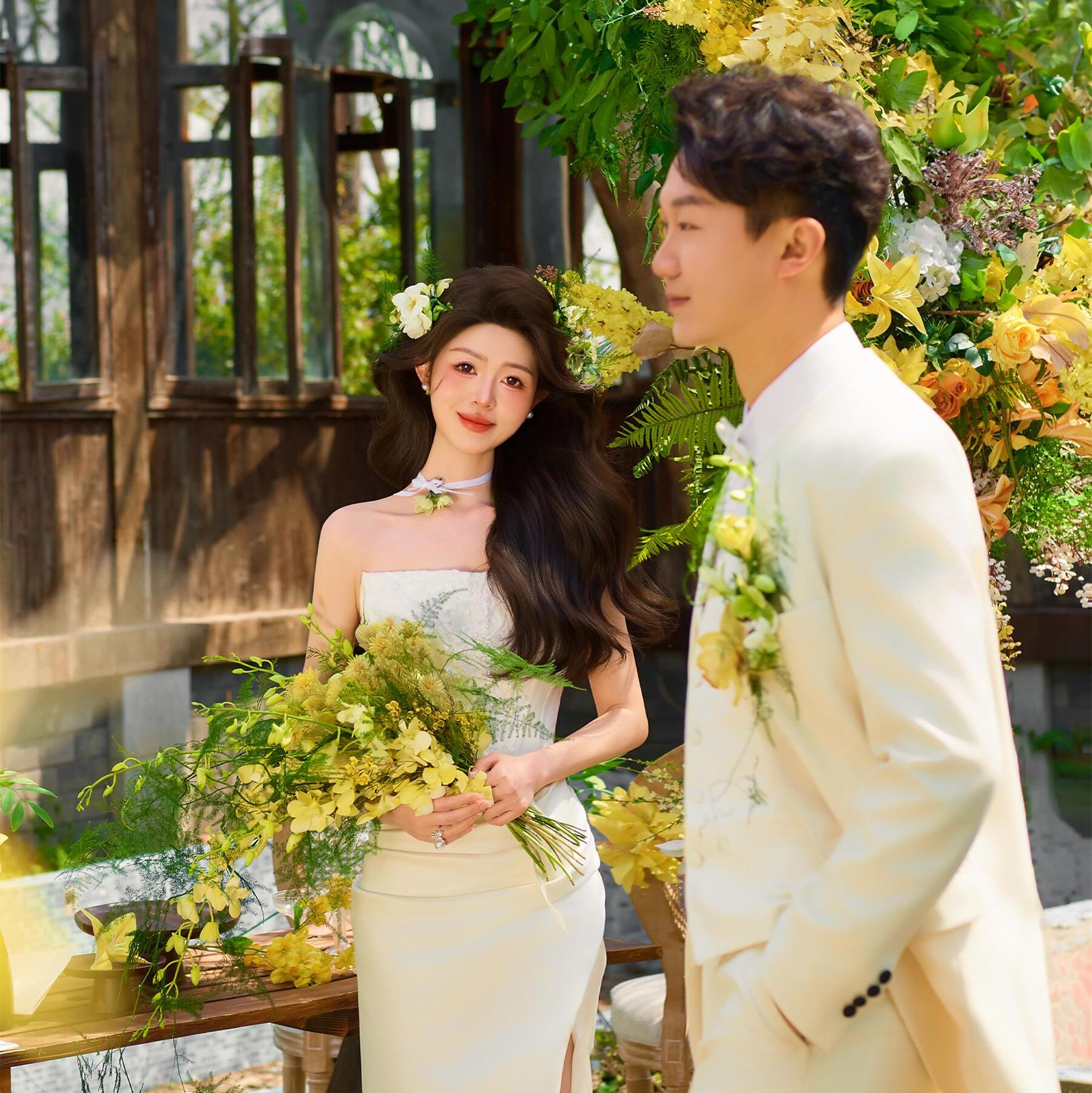 “这次拍摄的白色西装造型简直太惊艳了!纯白西装搭配白绿色系手捧花,整体造型清新又不失高级感,在简约的背景下显得格外干净利落。摄影师特别擅长捕捉自然的光影,把西装的质感拍得很有层次,手捧花的清新色调也表现得恰到好处。整个团队的服务非常专业,从服装搭配到拍摄引导都让人很放松,最后成片的效果既大气又充满细节,完全就是我们想要的清爽时尚风格。强烈推荐给喜欢简约质感的新人们!